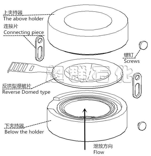 在爆破片的拱面或者凹面上,加工有“十”字形減弱槽,凸面接觸介質(zhì),凹面處于泄放側(cè)。爆破時,爆破片向凹面?zhèn)确D(zhuǎn)的同時沿槽破裂,泄放壓力。