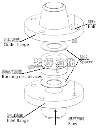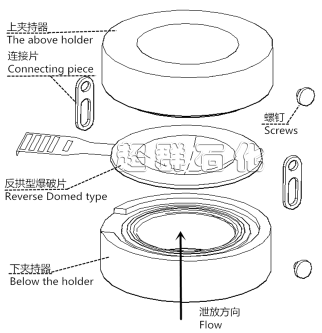 爆破片為單層膜片,凸面處于受壓側,超壓時,爆破片 失穩(wěn)翻轉,被上夾持器內的刀架刺破,泄放壓力,保護容器 安全。